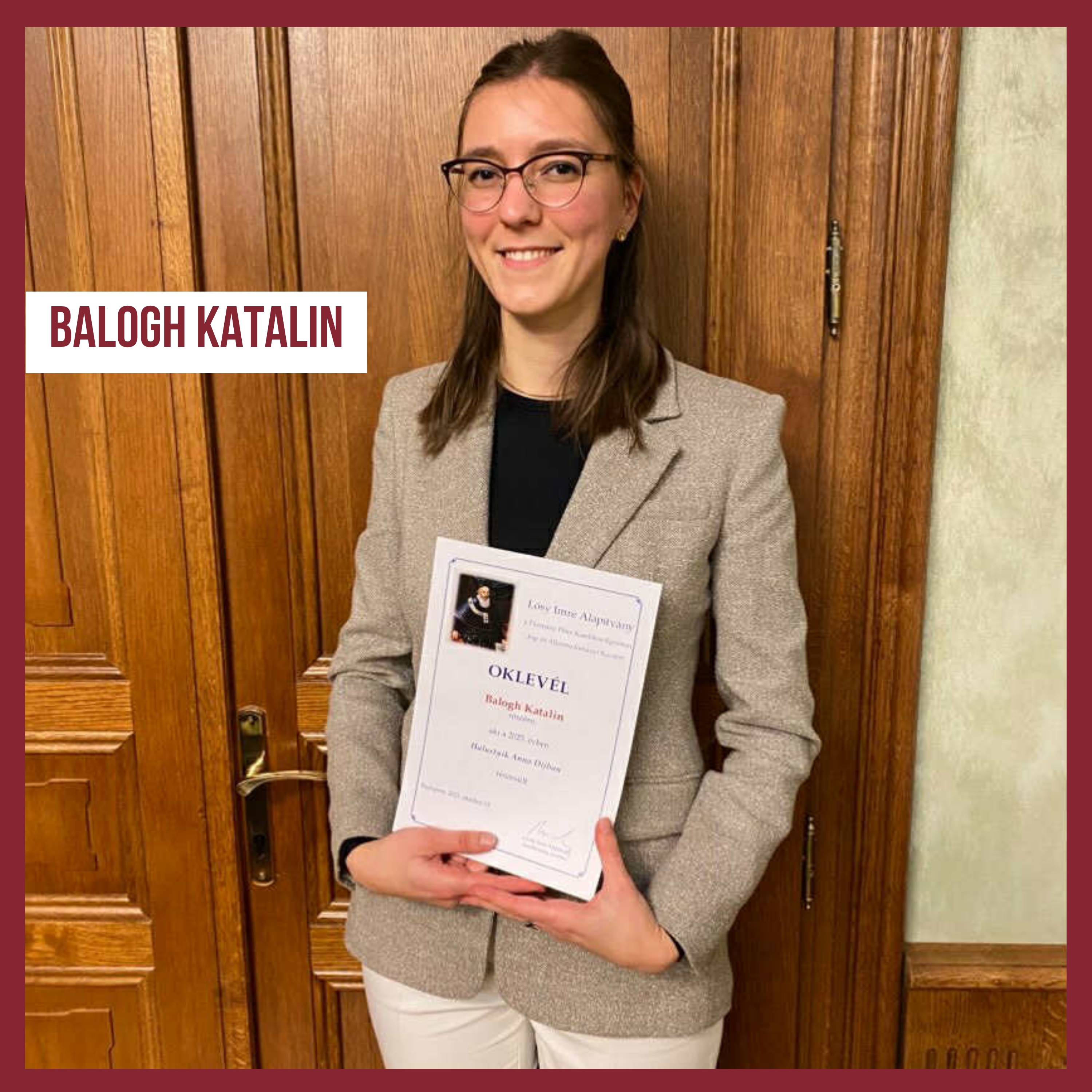 A 2025/26-ös tanévben Kopits ösztöndíjat nyert Tama Kristóf hallgatónk, Pázmány Alapítvány ösztöndíjat nyert Blatt Kamilla, és Halustyik Anna-díjat nyer Balogh Katalin.