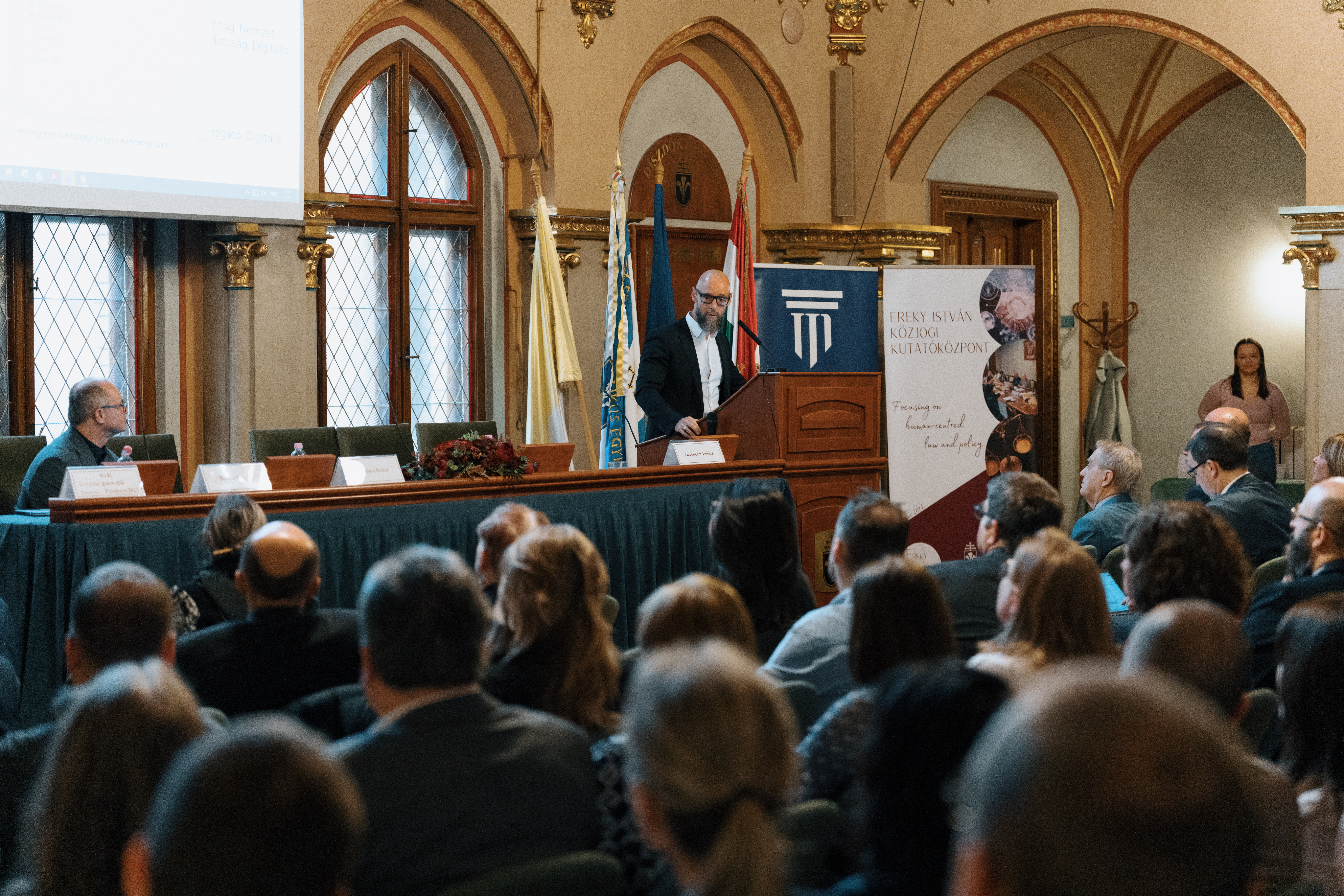 A rendezvényt megnyitó Dr. Komáromi László dékán úr hangsúlyozta, hogy a jogtudománynak és az egyetemi szférának proaktív szerepet kell vállalnia a digitális robbanás keretezésében. Az Adatnap mára a hazai szakmai dialógus első számú platformjává vált, ahol az emberközpontú jövő zálogát kutatják. Ehhez szorosan kapcsolódva Dr. Gerencsér Balázs, az Ereky István Közjogi Kutatóközpont igazgatója felhívta a figyelmet arra a különleges alkalomra, hogy az idei konferencia egybeesik a központ névadója, a modern magyar közigazgatástudomány megkerülhetetlen alakja, Ereky István születésének 150. évfordulójával. Ez a jubileum méltó alkalmat ad a közigazgatási alapok és az adatvezérelt kormányzás kapcsolatának alapos újragondolására. Kiemelte, hogy a kutatóközpont és a társszervezők küldetése egy olyan élő szakmai híd fenntartása az elméleti kutatások és a gyakorlati adathasznosítás között, amely biztosítja, hogy a magyar adatvagyon kezelése ne csupán technikai folyamat legyen, hanem a nemzetstratégiai célokat és a közbizalmat erősítő, átlátható és fenntartható rendszer.