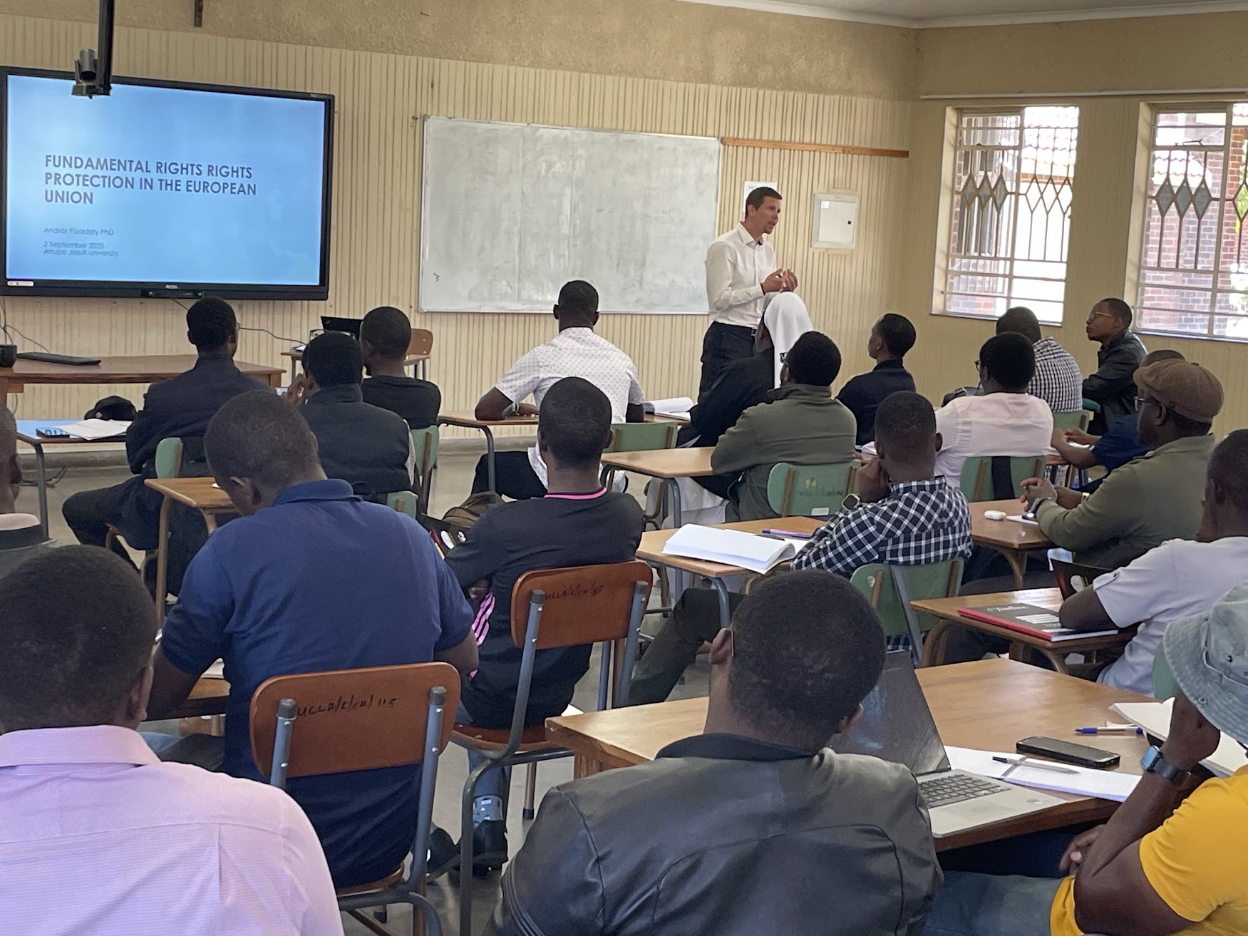 Pünkösty András oktatónk augusztus 25. és szeptember 11. között a zimbabwei Harare városában található Arrupe Jesuit University-n tett akadémiai látogatást. András augusztus 28-án nyilvános előadást tartott „Artificial Intelligence Regulation in the European Union: The First Attempt to Regulate AI Comprehensively” címmel, illetve szeptember 4-én „The Challenges of Regulating Generative AI and Its Impact on Higher Education” témában interaktív szemináriumot vezetett az egyetem oktatói, munkatársai számára. Az előadások mellett Pünkösty András aktívan részt vett az oktatásban is az AJU-n tett látogatása során, ahol nemzetközi jogi, valamint a jogfilozófiai kurzus keretében tartott további órákat.