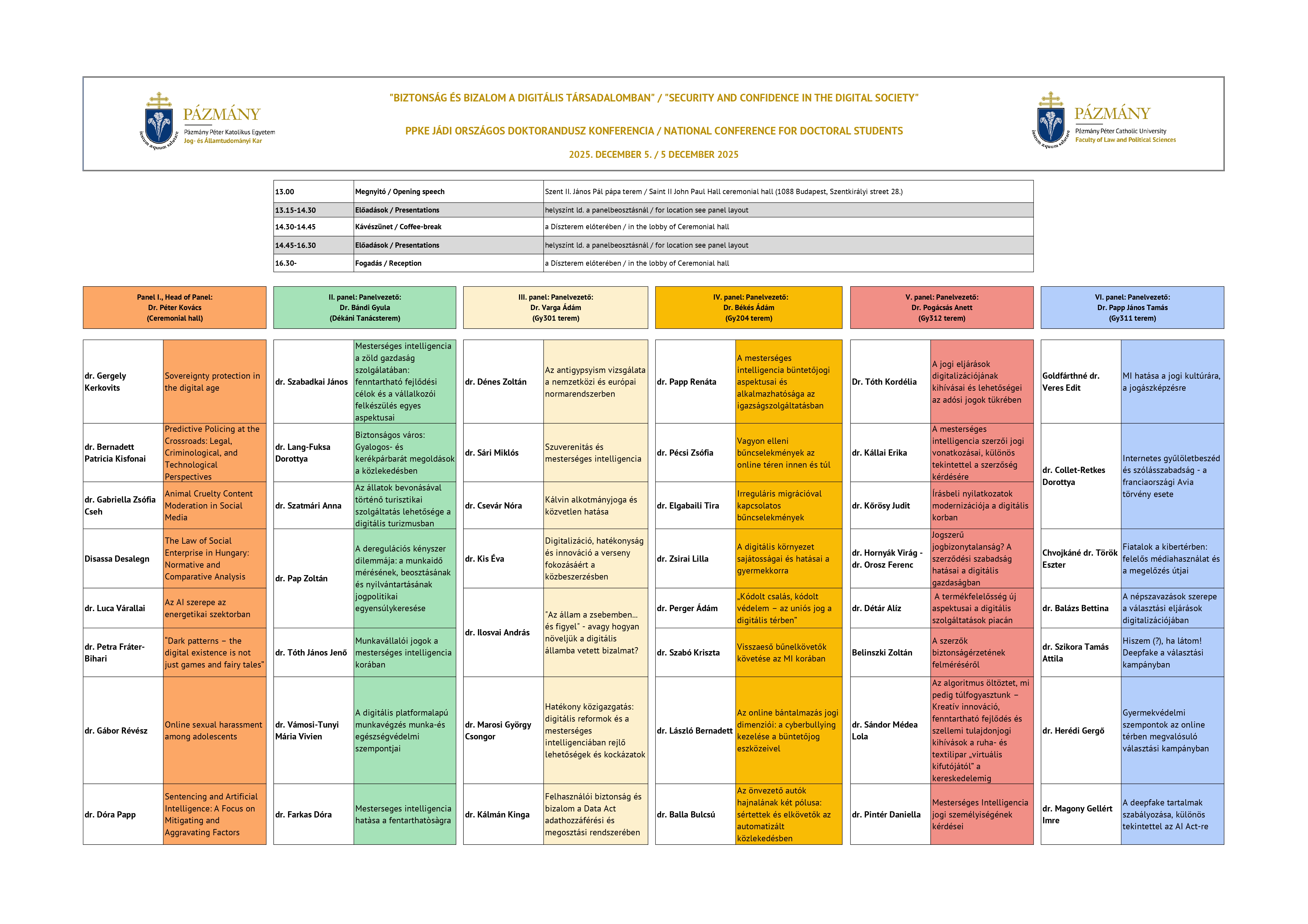 "Fejezetek, tanulmányok a doktori értekezés köréből" 2019"Fejezetek, tanulmányok a doktori értekezés köréből" "Fejezetek, tanulmányok a doktori értekezés köréből" 2018"Fejezetek, tanulmányok a doktori értekezés köréből""Fejezetek, tanulmányok a doktori értekezés köréből" 2017"Fejezetek, tanulmányok a doktori értekezés köréből" 2016"Fejezetek, tanulmányok a doktori értekezés köréből"A menekültválság kezelésének etikai és jogi szempontjai - Menekültválság és perspektívája: multikulturalizmus versus nemzetépítés és társadalomkohézió? 20151990-2015: 25 év - melyek a legmarkánsabb változások a jogban?„Keresztény erkölcs és jogászi etika" – miként érvényesül az etika a jogban? „In memoriam Zlinszky János" 2014Az első világháború és hatása a jog és jogágak fejlődéséreVálasztások - parlamentáris demokrácia - új kormányzati rendszer - jogági hatások 2013Környezetvédelem és jogA család a jogban és a társadalomban 2012Az alaptörvény egy éve és hatása a jogágakraAz új Btk. tervezet, válaszok a kihívásokra? 2011Az európajog magyarországi érvényesülésének lehetőségei, akadályai, példáiAz egyházakkal összefüggő kérdések a hazai és az európai joggyakorlatban 2010Jogállamiság és Magyarország - tapasztalatok 20 év utánVallás, társadalom, állam és jog 2009Jogi kérdések összehasonlító jogi, illetve nemzetközi jogi vagy európajogi perspektívábanA jogtudomány és a joggyakorlat különös egymásra hatása 2008De lege ferenda - Jogalkotási javaslatokAlapvető jogok, jogosultságok 2007Jogelvek érvényesülése - dogmatikai problémák 2006A jogi felelősség