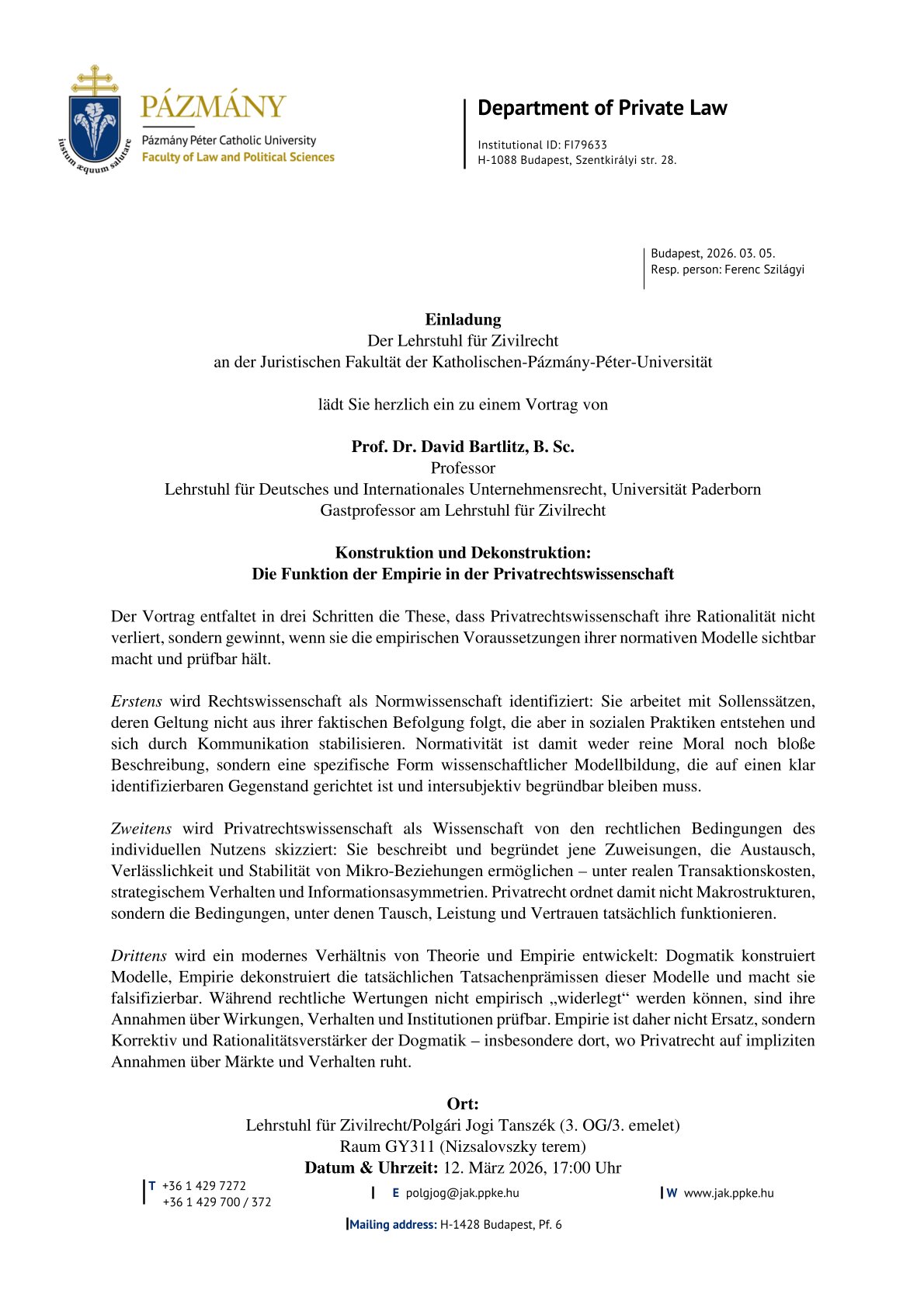 A Polgári Jogi Tanszék szeretettel meghívja Önt Prof. Dr. David Bartlitz, B. Sc., a Paderborni Egyetem Német és Nemzetközi Vállalati Jogi Tanszékének professzora, a Polgári Jogi Tanszék vendégprofesszora előadására, amelynek címe: "Konstruktion und Dekonstruktion: Die Funktion der Empirie in der Privatrechtswissenschaft".